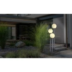 Diese Außenlampe (ø 45 cm) besticht durch ihr stilvolles Design aus anthrazitfarbenem Edelstahl und Aluminiumdruckguss. Die 160 cm große Außenleuchte besteht aus einem runden Sockel, an dem drei Stäbe unterschiedlicher Größe fixiert sind. Diese verfügen über drei opalene Glaskugeln, welche die E27-Fassungen beinhalten. Diese können mit passenden LED-Leuchtmitteln Ihrer Wahl bestückt werden, wodurch Sie in der Lage sind, Lichtfarbe und Helligkeit individuell zu bestimmen. Durch mehrere Artikel der gleichen Serie können Sie in Ihrem Außenbereich für eine gemütliche Atmosphäre sorgen und das Gesamtbild komplettieren.