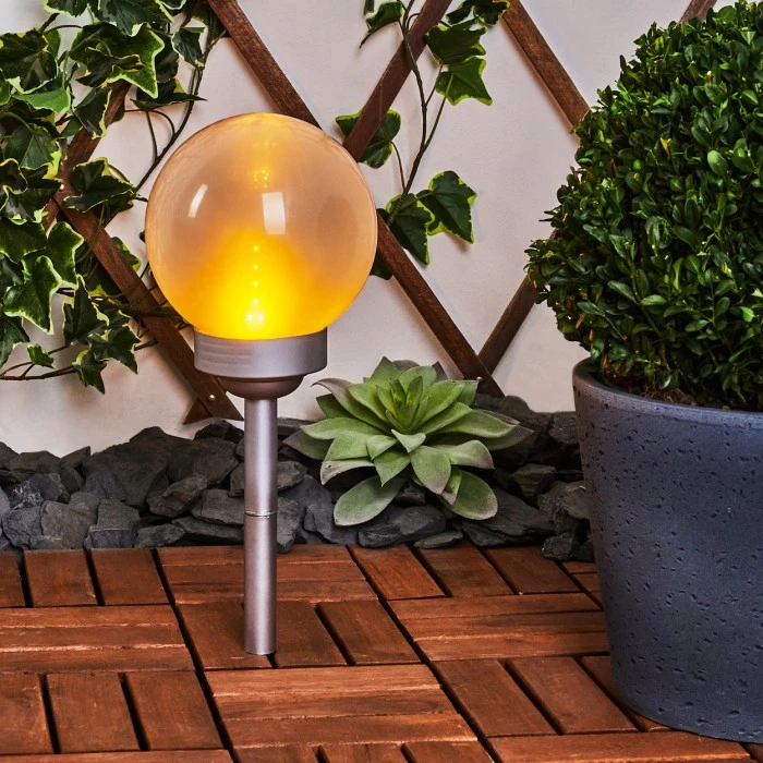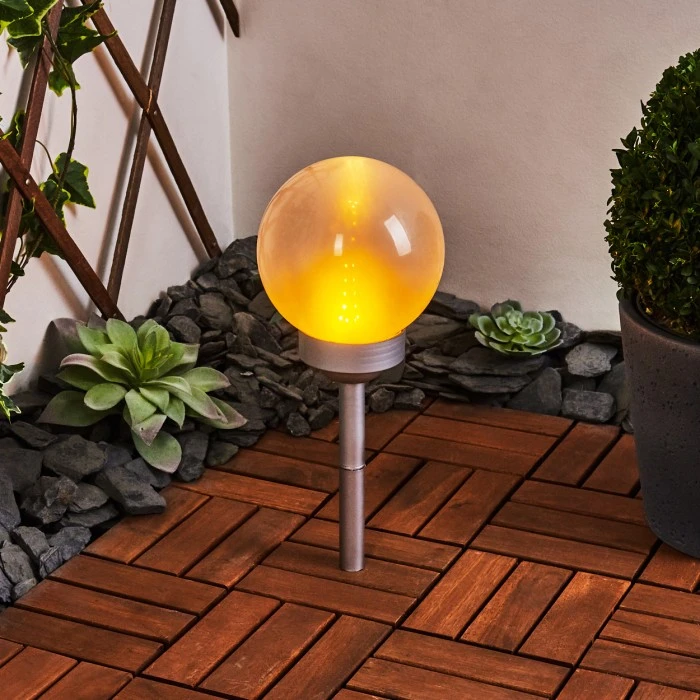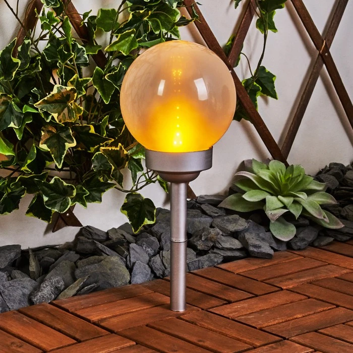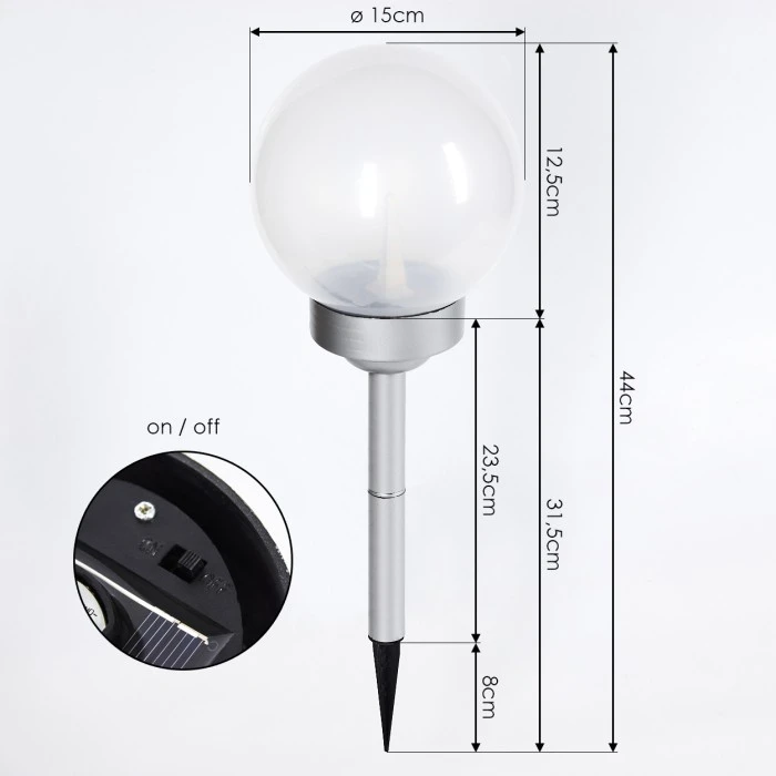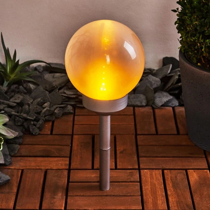 Die Leuchte verfügt über ein Solarpanel und einen eingebauten Akku mit einer Akkulaufzeit von ca. 6-8 Stunden. Dieser wird durch das Solarpanel aufgeladen. Es ist kein Stromanschluss nötig. Mittels Erdspieß kann die Solarleuchte an jeder beliebigen Stelle im Garten platziert werden. Dieser kann beliebig an- und abgeschraubt werden. Die Leuchte verfügt über einen An-/Ausschalter am Gehäuse. Mit tollem Flammeneffekt, der an das Flackern einer Kerze erinnert.