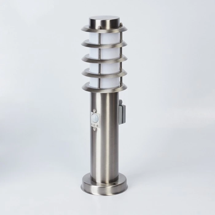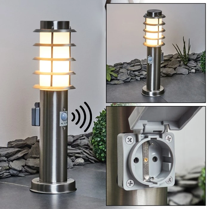 In diese Leuchte ist eine Steckdose mit Schutzabdeckung integriert.