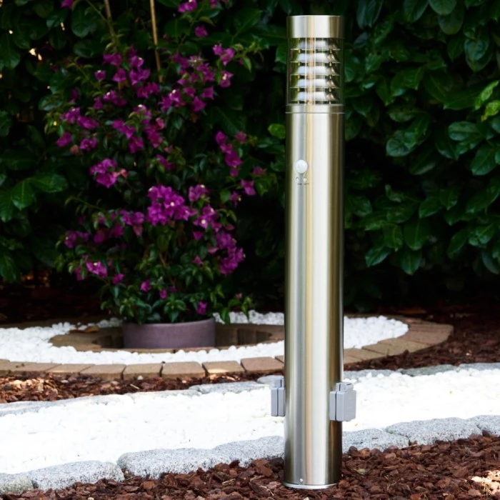 Mit zwei Außensteckdosen mit Schutzabdeckungen.